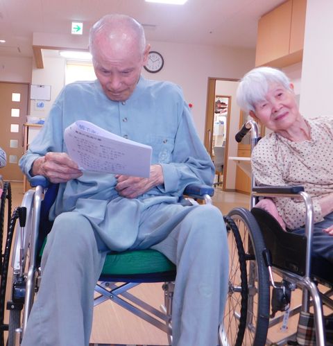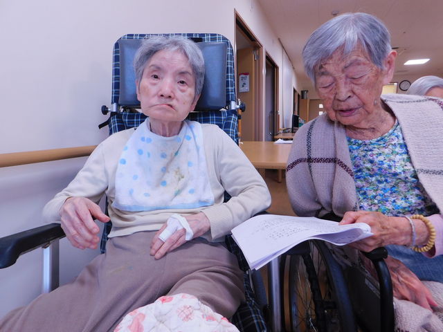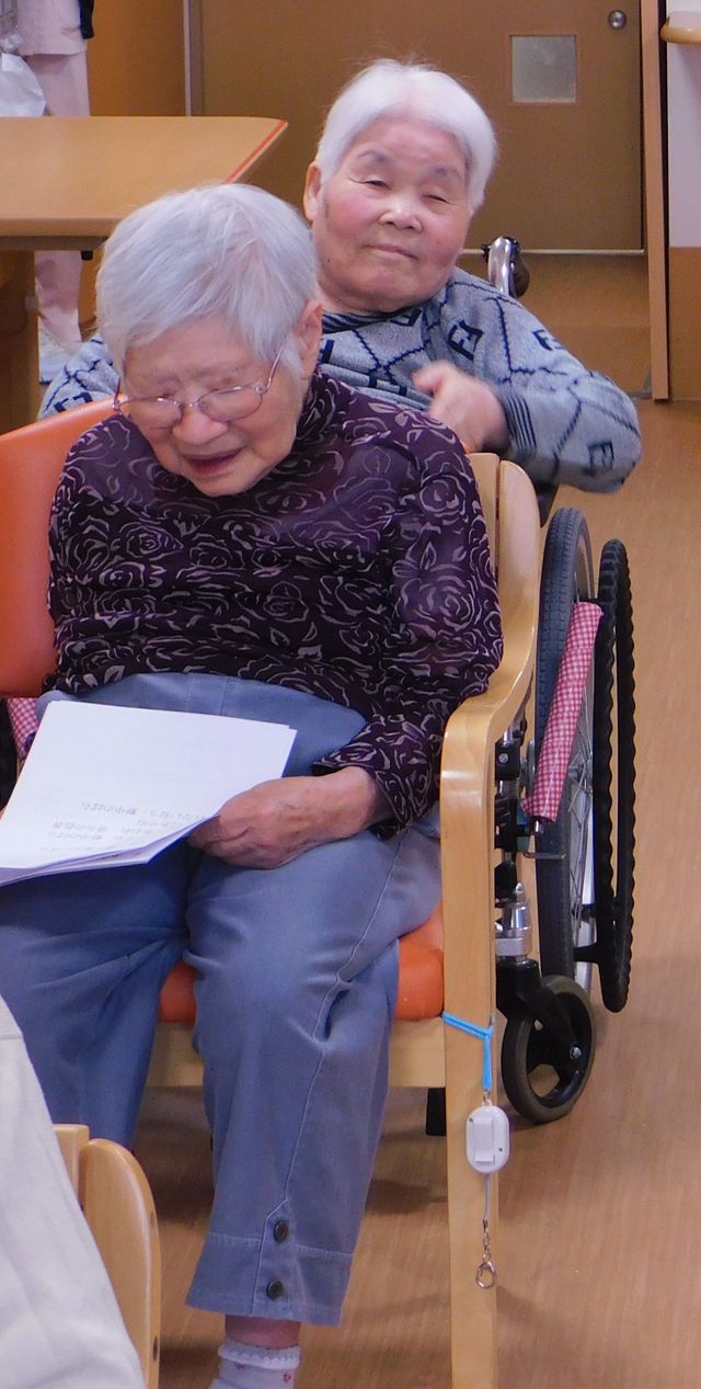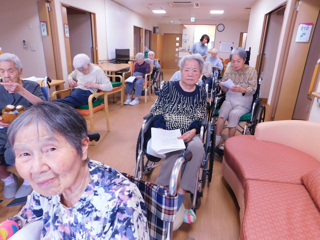 普段はベットで過ごしがちな方も、この日は車いすでフロアーに出て、大きな声で歌いました。