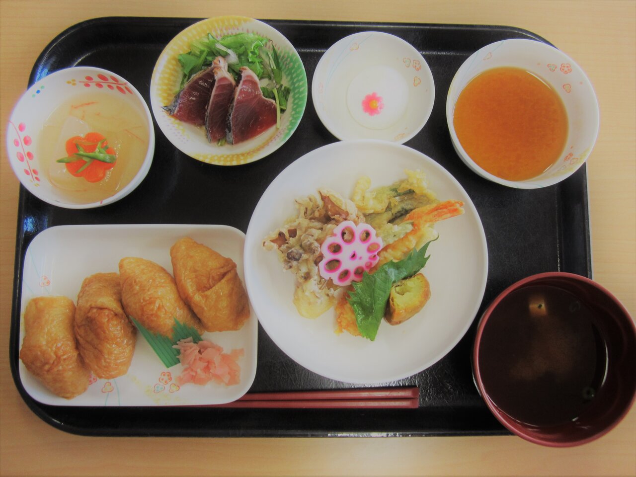 2021年11月30日 薔薇の樹苑/R3.11お楽しみ献立 薔薇の樹苑 栄養科より11月のお楽しみ献立の紹介です。11/19(金)昼食にお楽しみ献立を提供しました。~献立~いなり寿司、天ぷら盛り合わせ、鰹のたたき、冬瓜のあんかけ、赤出汁、季節の和菓子「いなりに天ぷらに、今日はとても豪華ですね」とのお言葉を頂きました。15時のおやつにはマロンケーキを提供しました。今後も皆様によろこんで頂ける食事作りに努めて参ります。薔薇の樹苑 栄養科 「薔薇の樹苑」カテゴリの最新記事 < 前の記事次の記事 >