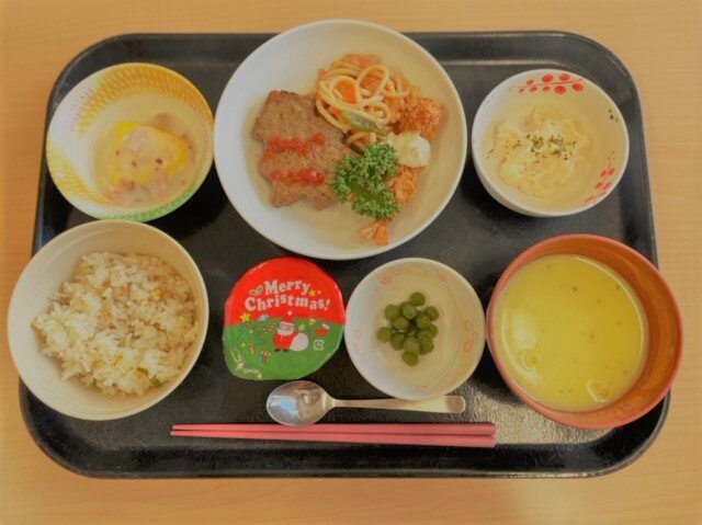 2021年12月29日 薔薇の樹苑/R3.12お楽しみ献立 薔薇の樹苑 栄養科より12月のお楽しみ献立の紹介です。12/24(金)昼食にお楽しみ献立を提供しました。~献立~ピラフ、もみの木ハンバーグ、エビフライ、ナポリタン、オムレツ、タラモサラダうぐいす豆、コーンポタージュ、クリスマスゼリーいつもよりも量が多かったですが、完食されるご利用者の方も多かったです。15時のおやつにはイチゴケーキを提供しました。お正月にはおせち料理の提供を予定しています。今後も皆さまに喜んで頂けるお食事を提供できるよう、努めて参ります。薔薇の樹苑 栄養科 「薔薇の樹苑」カテゴリの最新記事 < 前の記事次の記事 >