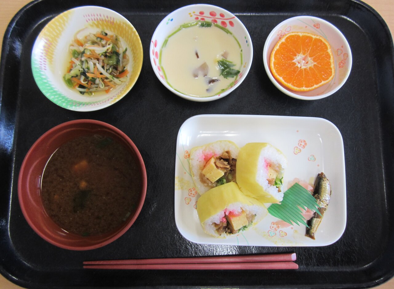 2022年02月28日 薔薇の樹苑/R4.2お楽しみ献立 薔薇の樹苑 栄養科より2月のお楽しみ献立の紹介です。2月3日昼食にお楽しみ献立を提供しました。~献立~太巻き、茶碗蒸し、春菊の和え物、鰯のうめ煮、赤出汁、みかん恵方巻の海苔を薄焼き卵に変更して、咀嚼・嚥下に不安のある方でも食べやすくしています。おやつには、節分の豆に見立てた卵ボーロを提供しました。今後も皆さまに喜んで頂けるお食事を提供できるよう、努めて参ります。薔薇の樹苑 栄養科 「薔薇の樹苑」カテゴリの最新記事 < 前の記事次の記事 >
