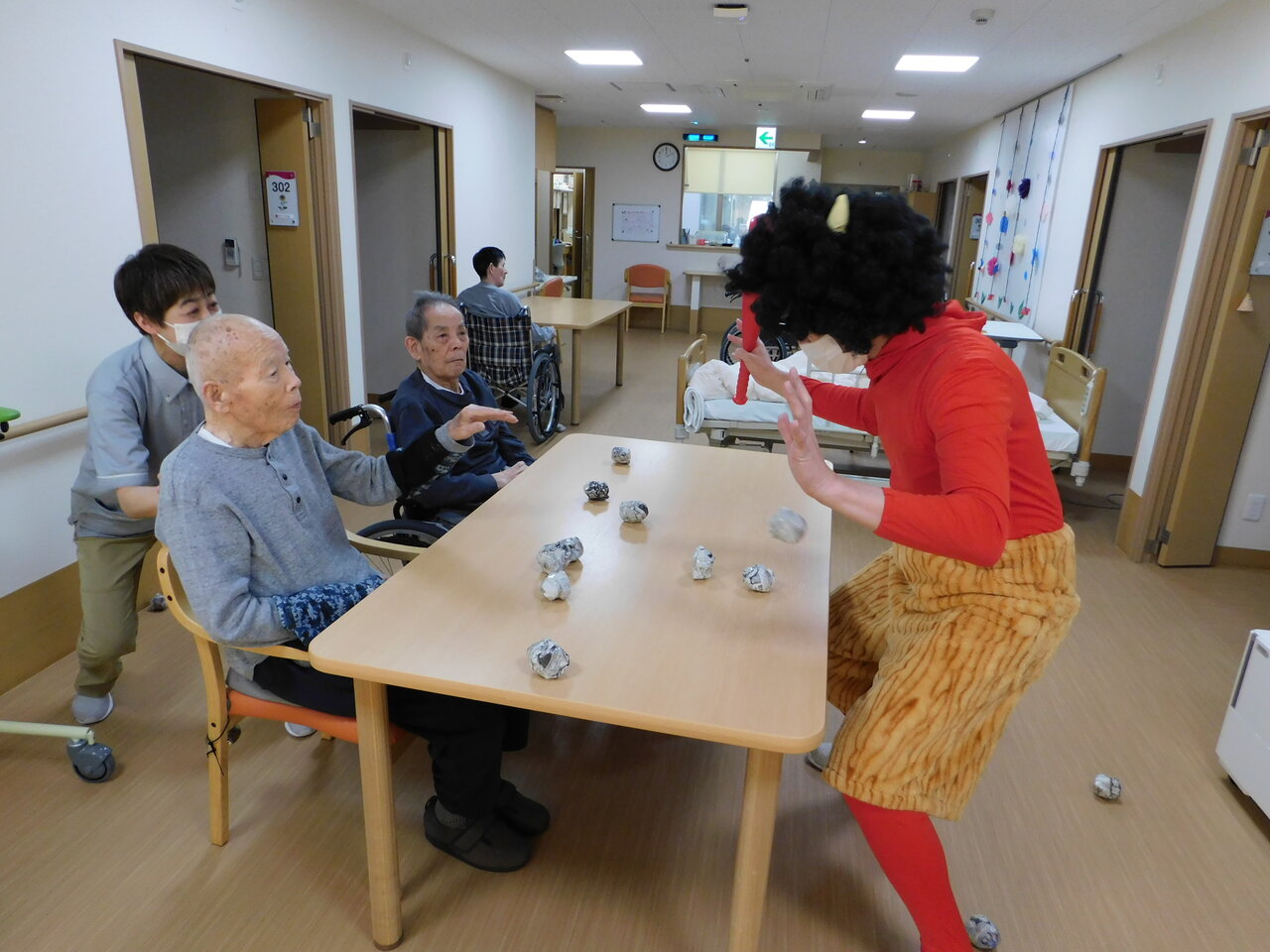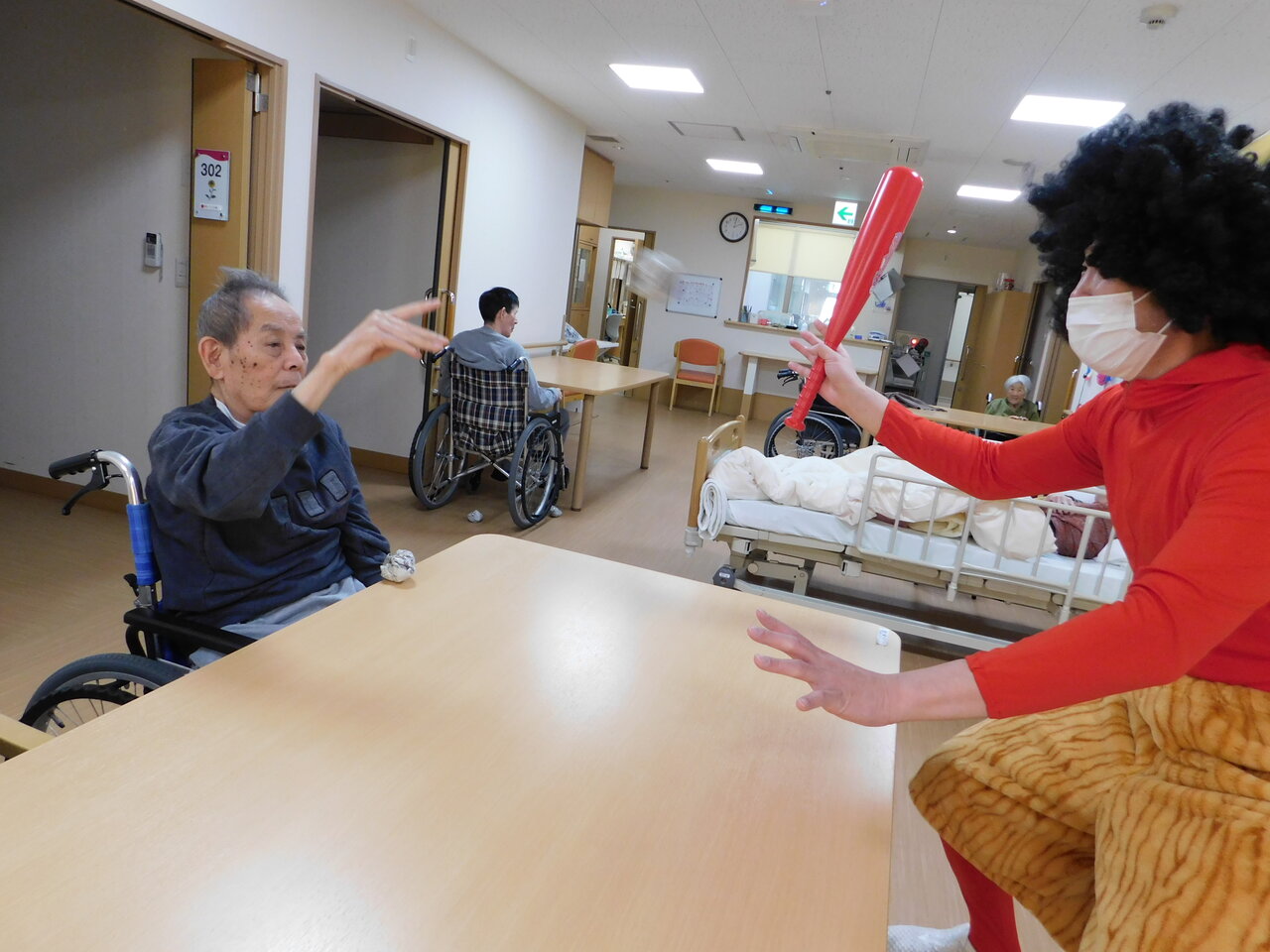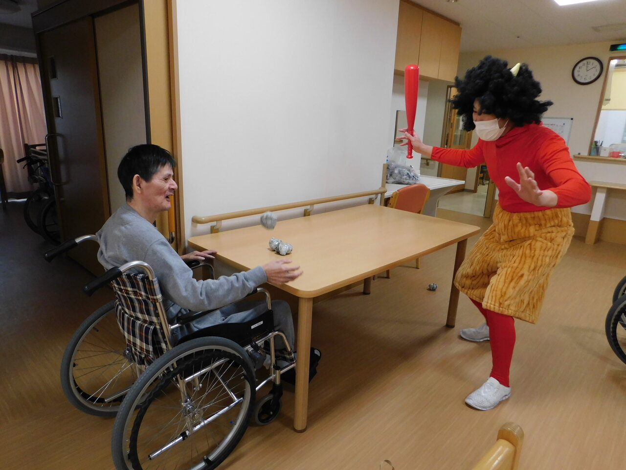 2022年03月19日 ムーンシャドウ/節分レクリエーション(3階南) こんにちは、ムーンシャドウの3階南です。 3階南では2月のレクリエーションとして、節分にちなんだゲームを実施しました。 職員が鬼の格好に扮し、フロアを回ります。入所者様には「鬼は外、福は内」と言いながら、豆に見立てたボールを鬼に向かって投げて頂きました。普段はゆっくり過ごされている入所者様も鬼には容赦なくボールを投げつけます。(笑)今年もまだ始まったばかり、福の神様に沢山来て頂いて、縁起の良い年になると良いですね。(^▽^)/ カテゴリなしの他の記事 < 前の記事次の記事 >