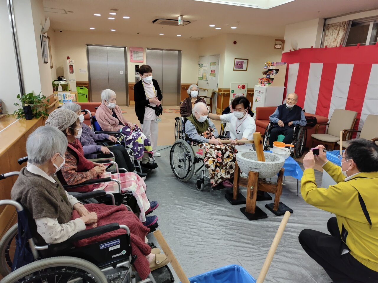 9:30に餅つき開始。蒸した米をスタッフがこねていると、3階のご利用者様から集まってこられました。