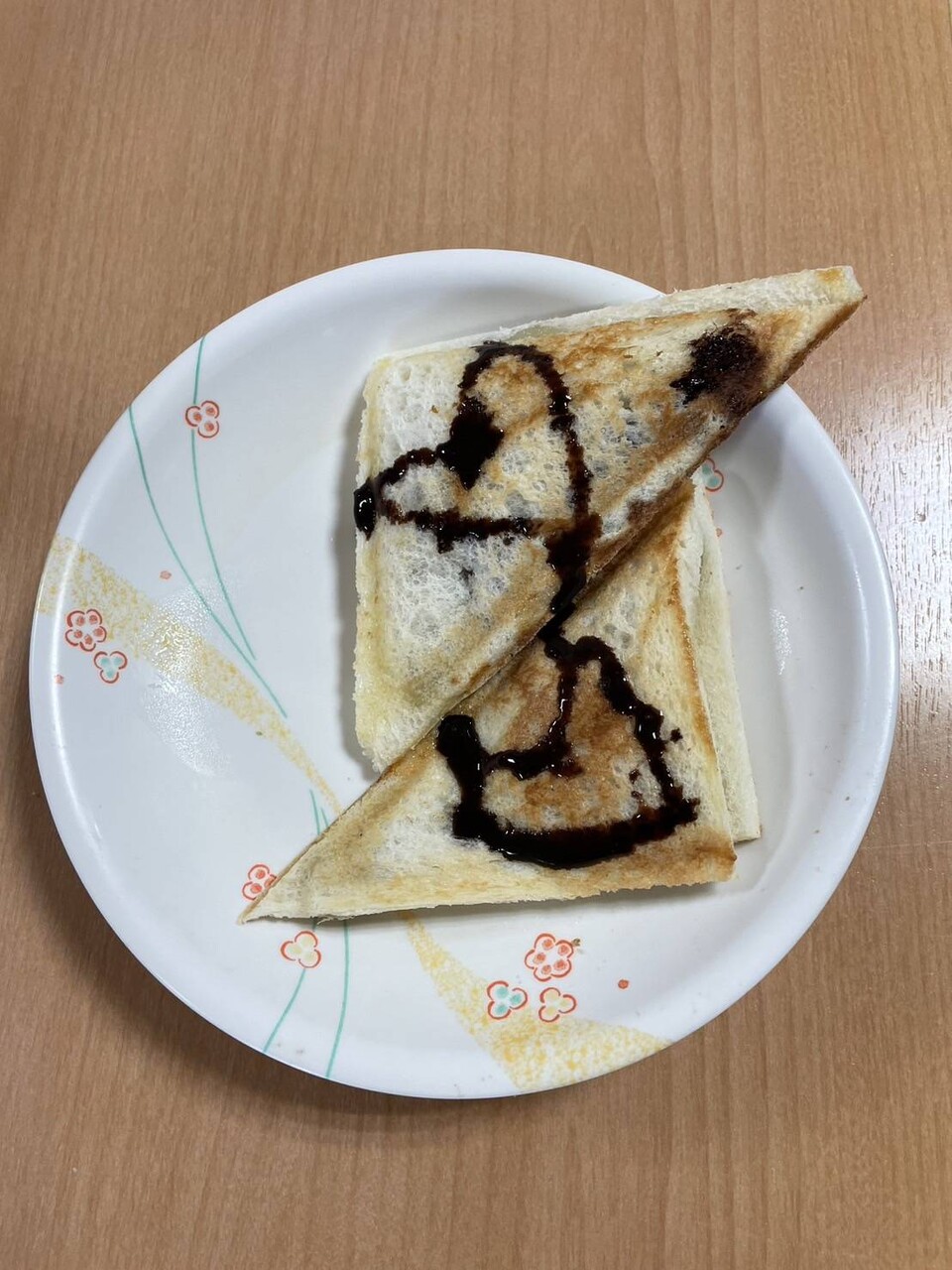 内容はお手軽です。パンにマシュマロやバナナを薄く切ったものを挟んで軽く焼き上げ、チョコでデコレーション。フフ。ハートマーク。フフ。かわいい。