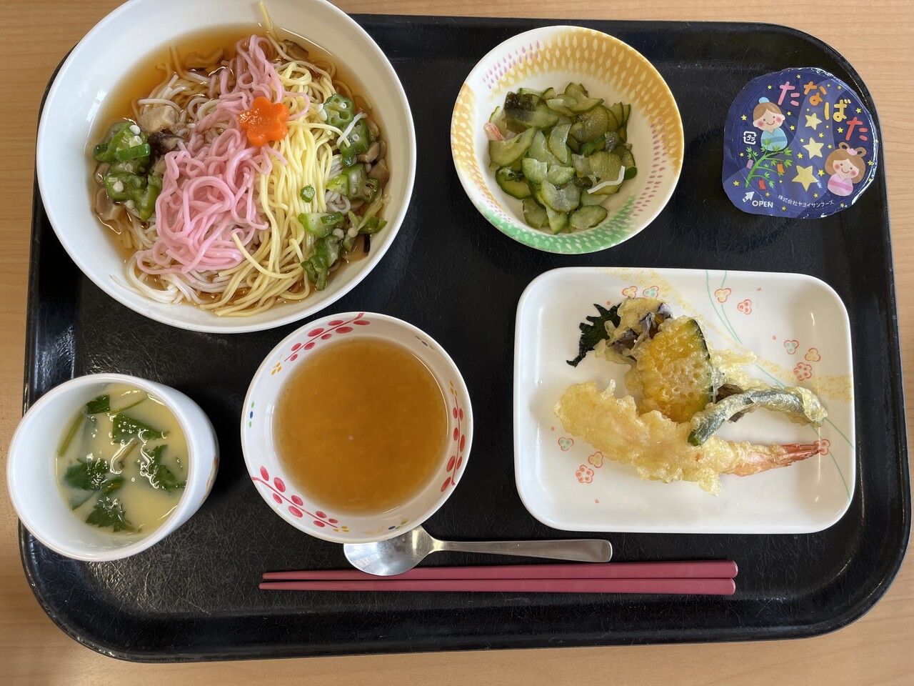 2024年07月06日 薔薇の樹苑/R6.7月お楽しみ献立 薔薇の樹苑 栄養科より7月のお楽しみ献立の紹介です7月5日昼食にお楽しみ献立を提供しました七夕の行事食です~献立~七夕そうめん天ぷら盛り合わせ茶碗蒸し胡瓜のかに酢和え星型ゼリー天の川に見立てた三色のそうめんを提供しました15時のおやつには、四季の和菓子「海開き」を提供しました今後も安全で美味しいお食事を提供できるよう、努めてまいります。薔薇の樹苑 栄養科 「薔薇の樹苑」カテゴリの最新記事 < 前の記事次の記事 >