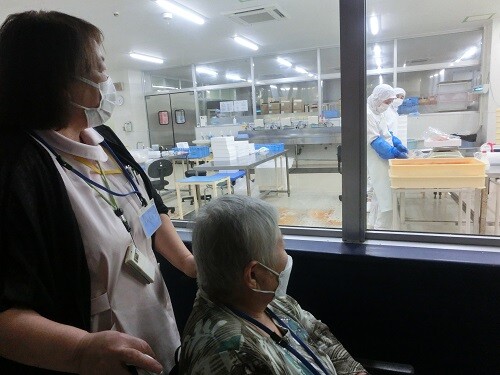 実際に窓越しに見学され、明太子の出来上がりは