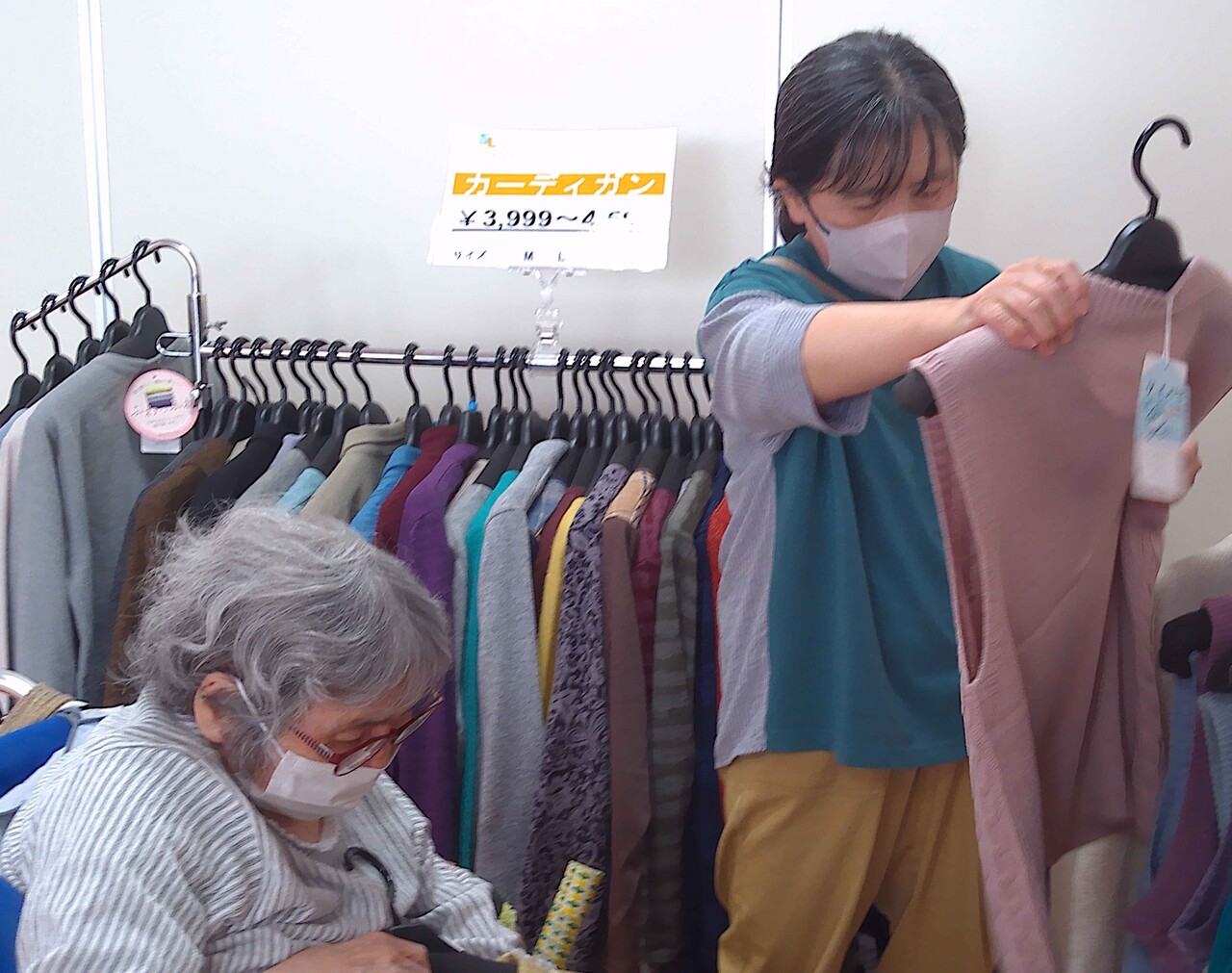 毛糸のカーディガンを見ながら「これいいね。」「こっちは?」