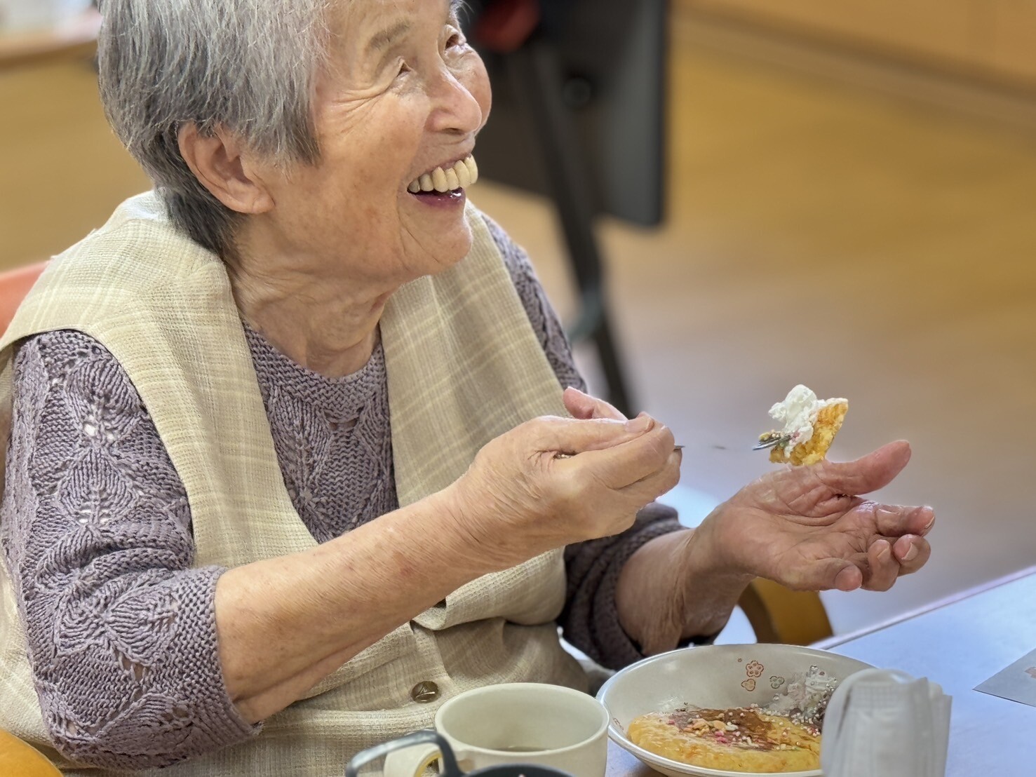 我デイサービスのお母さんが腕に寄りを掛けて焼いています✨