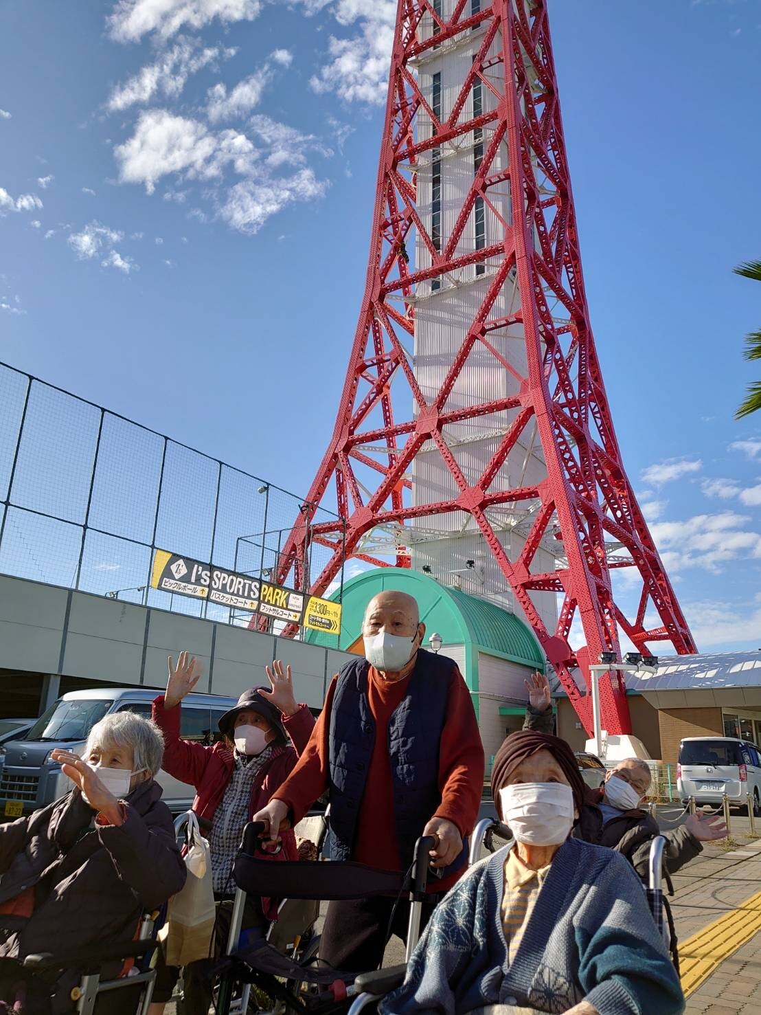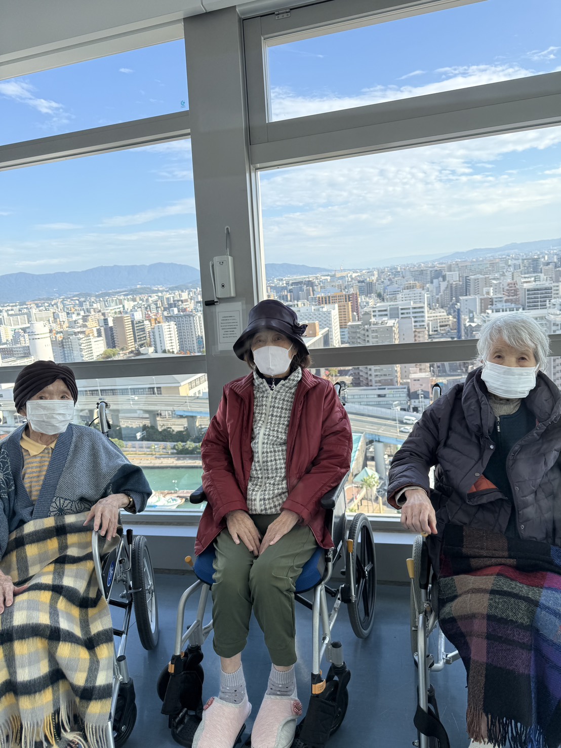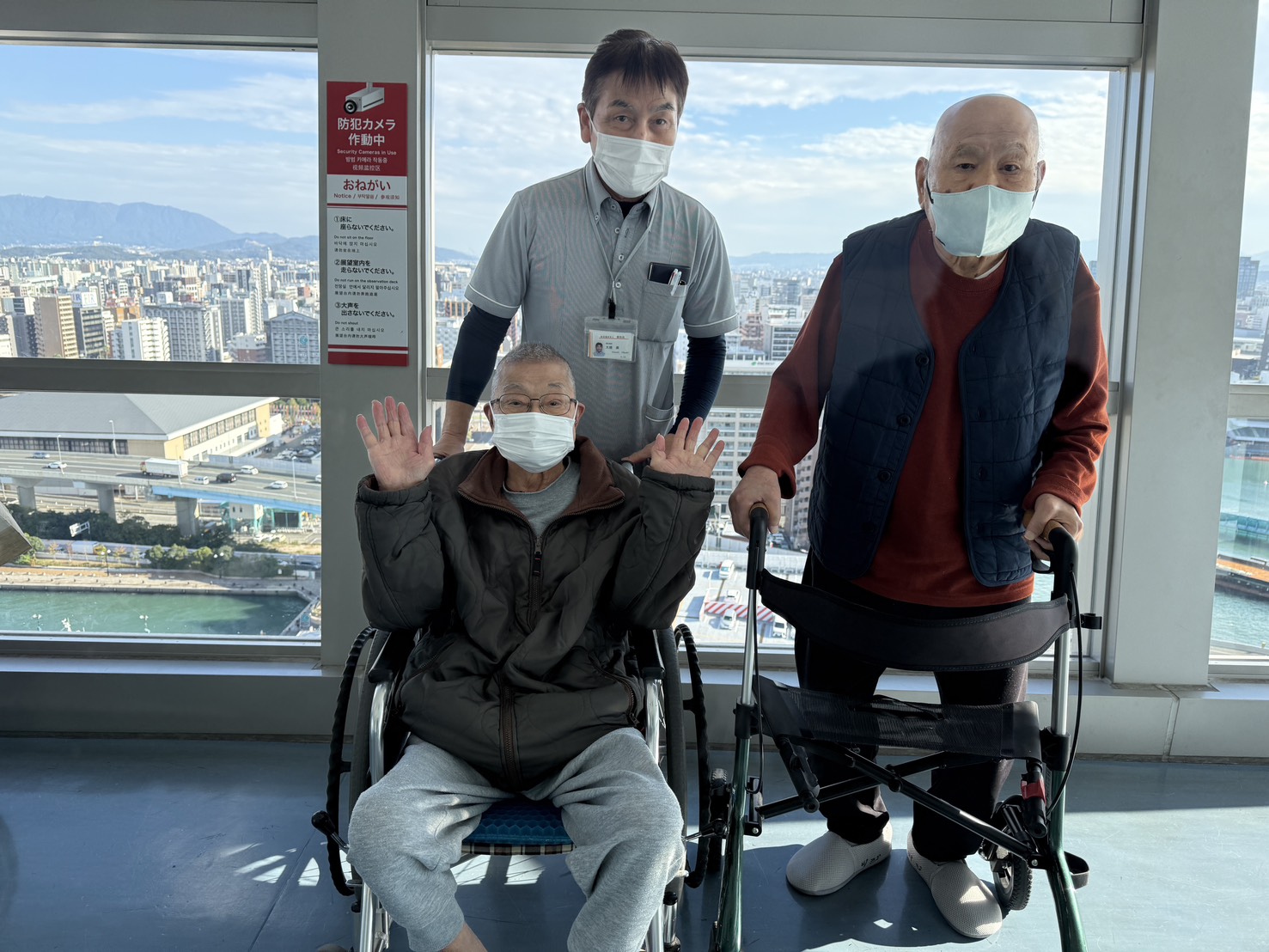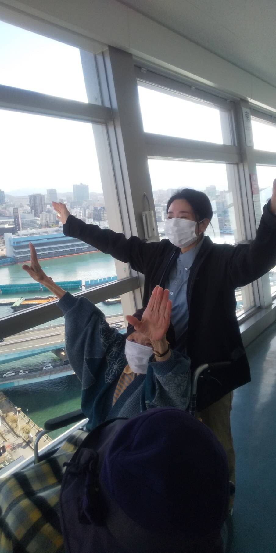 天気も良く遠くまで眺めることができました。ちょうど大きなクルーズ船も停泊していて「大きな船やね」と見入ったり、「空港はどっちやったかな」と職員と探してみたりしてみました。